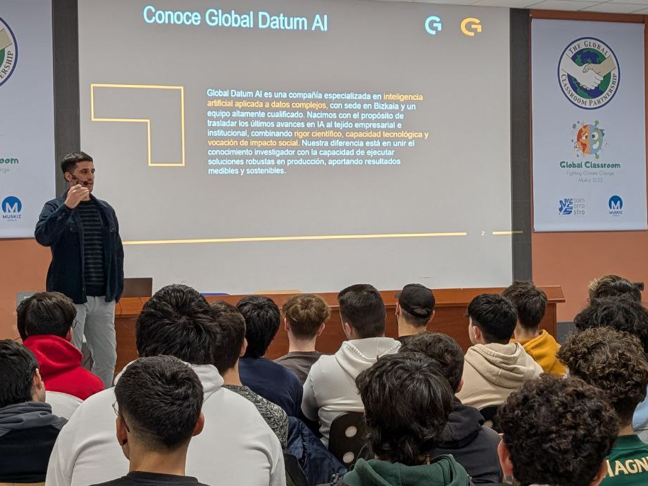 A continuación, Iker Jauregibeitia, General Manager de Global Datum, intervino junto a Jon Álvarez, antiguo alumno del centro. Presentaron varios proyectos basados en IA generativa orientados a la búsqueda eficiente de información y a la optimización de procesos empresariales, destacando un caso práctico de optimización de la recogida de residuos en A Coruña mediante algoritmos de aprendizaje automático.