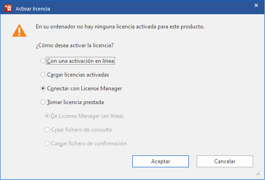 Si sucede, acepta los mensajes hasta llegar al apartado Activar Licencias.Seleccionamos Conectar con License Manager.